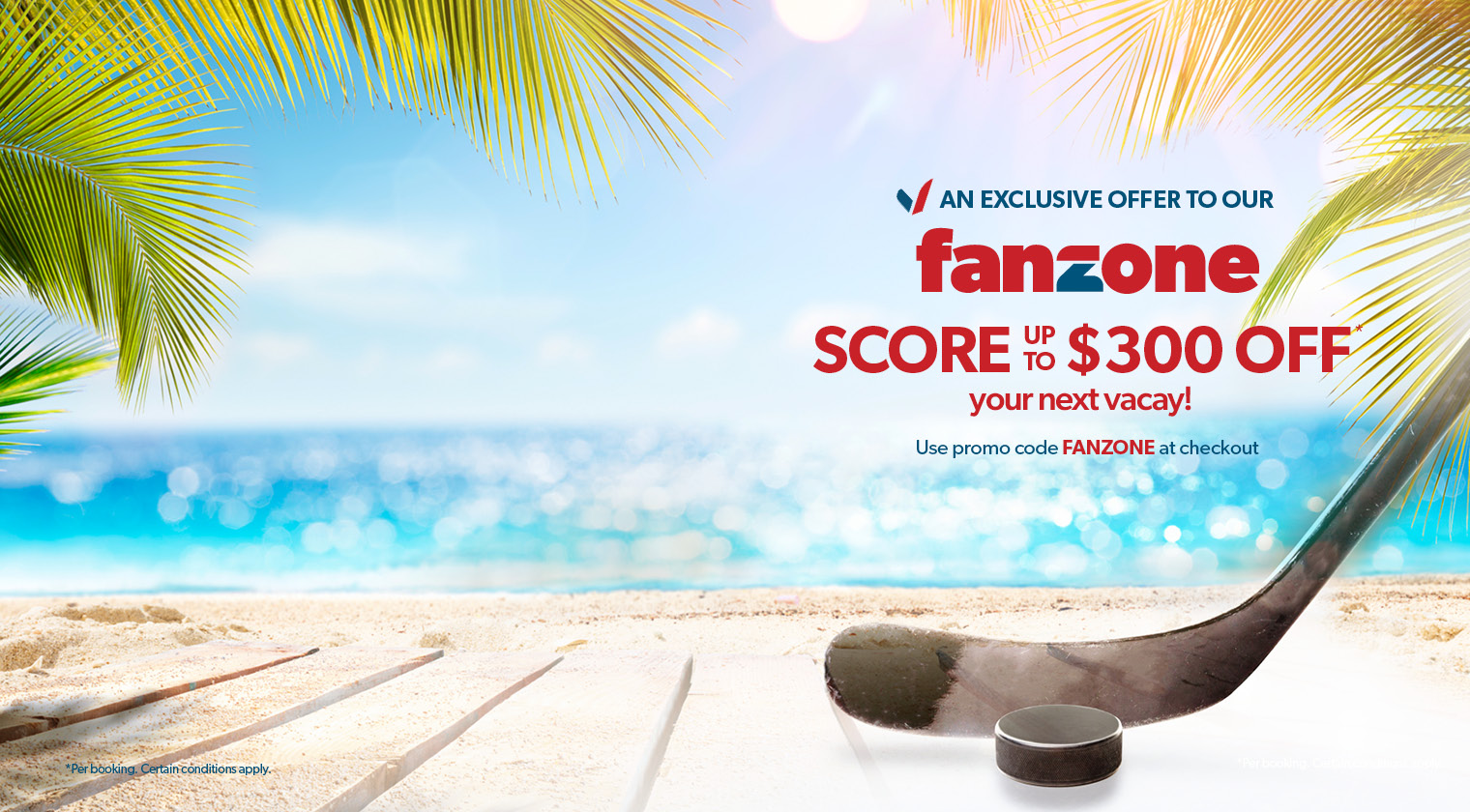 Promo code discount FANZONE is only applicable on new pre-packaged vacation bookings and select flight and hotel bundles made online from May 1, 2024 to July 31, 2025, for travel May 1, 2024 to December 31, 2025. $50 discount is applicable to bookings with a minimum purchase price of $899 - 1298 per person (before taxes & fees), unless otherwise stipulated on your promo code. Eligible on double, triple, and quadruple occupancy bookings. One promo code per booking (value of $50). Single occupancy bookings with a minimum purchase price of $899 - $1298 will receive a $25 discount per booking. $75 discount is applicable to bookings with a minimum purchase price of $1299 to $1498 per person (before taxes & fees), unless otherwise stipulated on your promo code. Eligible on double, triple, and quadruple occupancy bookings. One promo code per booking (value of $75). Single occupancy bookings with a minimum purchase price of $1299 - $1498 will receive a $37.50 discount per booking. $125 discount is applicable to bookings with a minimum purchase price of $1499 to $3998 per person (before taxes & fees), unless otherwise stipulated on your promo code. Eligible on double, triple, and quadruple occupancy bookings. One promo code per booking (value of $125).Single occupancy bookings with a minimum purchase price of $1499 - $3998 will receive a $62.50 discount per booking. $200 discount is applicable to bookings with a minimum purchase price of $3999 to $6998 per person (before taxes & fees), unless otherwise stipulated on your promo code. Eligible on double, triple, and quadruple occupancy bookings. One promo code per booking (value of $200). Single occupancy bookings with a minimum purchase price of $3999 - $6998 will receive a $100 discount per booking. $300 discount is applicable to bookings with a minimum purchase price of $6999 and up per person (before taxes & fees), unless otherwise stipulated on your promo code. Eligible on double, triple, and quadruple occupancy bookings. One promo code per booking (value of $300). Single occupancy bookings with a minimum purchase price of $6999 will receive a $150 discount per booking. Promo code cannot be exchanged for any cash value and must be entered or provided at the time of booking. The promo code discount amount is non-negotiable. Not combinable with any other discounts or promo codes. Not applicable to group bookings. The promo code offer is capacity controlled and can be changed or withdrawn at any time without notice. Promo Code must be provided at the time of booking. redtag.ca reserves the right to expire the promo code if it is not redeemed.