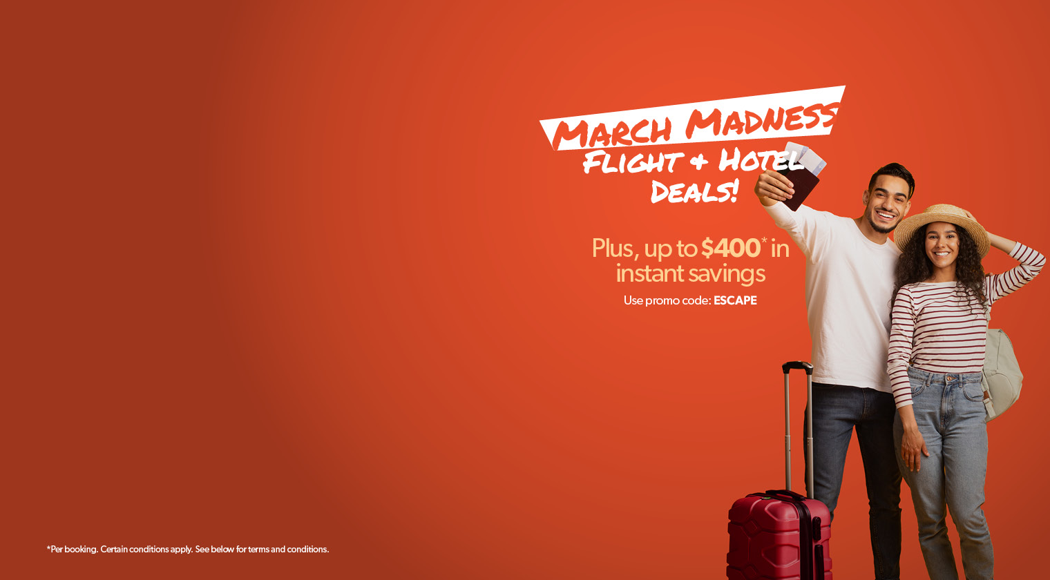 Promo code discount ESCAPE is applicable on select new pre-packaged vacation bookings with select suppliers and flight & hotel bundles between March 13 and 31, 2026 for travel departing between March 14, 2026 and December 31, 2026. $50 discount is applicable to bookings with a minimum purchase price of $999 to $1398 per person (before taxes & fees), unless otherwise stipulated on your promo code. Eligible on double, triple, and quadruple occupancy bookings. One promo code per booking (value of $50). Single occupancy bookings with a minimum purchase price of $999 to $1398 will receive a $25 discount per booking. $100 discount is applicable to bookings with a minimum purchase price of $1399 to $3998 per person (before taxes & fees), unless otherwise stipulated on your promo code. Eligible on double, triple, and quadruple occupancy bookings. One promo code per booking (value of $100). Single occupancy bookings with a minimum purchase price of $1399 to $3998 will receive a $50 discount per booking. $200 discount is applicable to bookings with a minimum purchase price of $3999 to $8998 per person (before taxes & fees), unless otherwise stipulated on your promo code. Eligible on double, triple, and quadruple occupancy bookings. One promo code per booking (value of $200). Single occupancy bookings with a minimum purchase price of $3999 - $8998 will receive a $75 discount per booking. $400 discount is applicable to bookings with a minimum purchase price of $8999 and up per person (before taxes & fees), unless otherwise stipulated on your promo code. Eligible on double, triple, and quadruple occupancy bookings. One promo code per booking (value of $400). Single occupancy bookings with a minimum purchase price of $8999 and up will receive a $150 discount per booking. Promo code cannot be exchanged for any cash value. The promo code discount amount is non-negotiable. Not combinable with any other discounts or promo codes. Not applicable to e-packages or group bookings. Not applicable on WestJet Vacations or Air Canada Vacations bookings. The promo code offer is capacity controlled and can be changed or withdrawn at any time without notice. Promo Code must be provided at the time of booking. redtag.ca reserves the right to expire the promo code at any time. All promotional rules are to be used in conjunction with the redtag.ca website terms of use. © 2026 redtag.ca. All Rights Reserved.