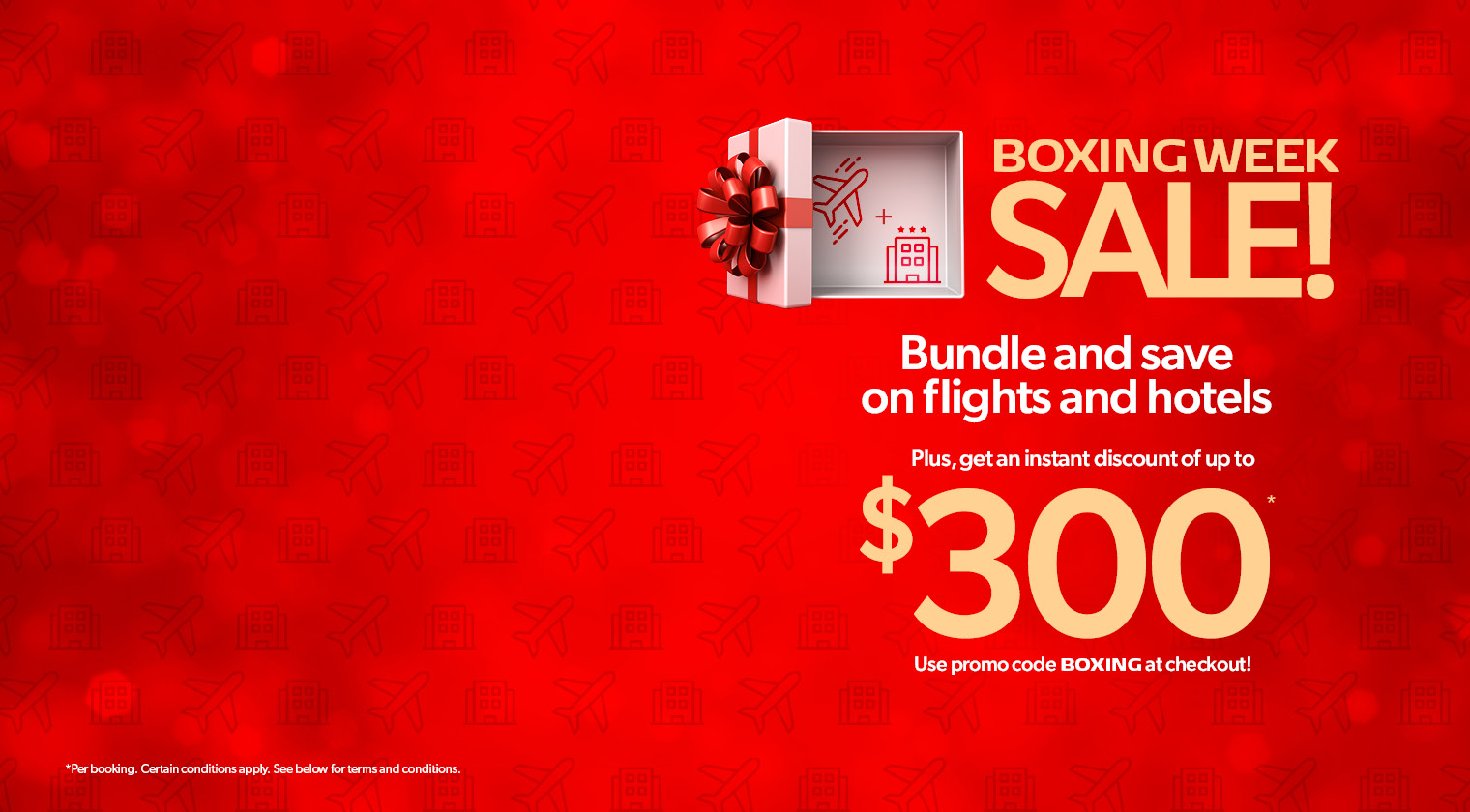 Promo code discount BOXING is applicable on select new pre-packaged vacation bookings with select suppliers and flight & hotel bundles between December 22, 2025 and January 2, 2026, for travel departing between December 23, 2025 and July 31, 2026. $50 discount on bookings is applicable with a minimum purchase price of $899 to $1298 per person (before taxes & fees), unless otherwise stipulated on your promo code. Eligible on double, triple, and quadruple occupancy bookings. One promo code per booking (value of $50). Single occupancy bookings with a minimum purchase price of $899 - $1298 will receive a $25 discount per booking. $75 discount on bookings is applicable with a minimum purchase price of $1299 to $1498 per person (before taxes & fees), unless otherwise stipulated on your promo code. Eligible on double, triple, and quadruple occupancy bookings. One promo code per booking (value of $75). Single occupancy bookings with a minimum purchase price of $1299 - $1498 will receive a $37.50 discount per booking. $100 discount on bookings with a minimum purchase price of $1499 to $3998 per person (before taxes & fees), unless otherwise stipulated on your promo code. Eligible on double, triple, and quadruple occupancy bookings. One promo code per booking (value of $100). Single occupancy bookings with a minimum purchase price of $1499 - $3998 will receive a $50 discount per booking. $200 discount is applicable on bookings with a minimum purchase price of $3999 - $6998 per person (before taxes & fees), unless otherwise stipulated on your promo code. Eligible on double, triple, and quadruple occupancy bookings. One promo code per booking (value of $200). Single occupancy bookings with a minimum purchase price of $3999 - $6998 will receive a $100 discount per booking. $300 discount is applicable on bookings with a minimum purchase price of $6999 & up per person (before taxes & fees), unless otherwise stipulated on your promo code. Eligible on double, triple, and quadruple occupancy bookings. One promo code per booking (value of $300). Single occupancy bookings with a minimum purchase price of $6999 & up will receive a $150 discount per booking. Promo code cannot be exchanged for any cash value. The promo code discount amount is non-negotiable. Not combinable with any other discounts or promo codes. Not applicable to group bookings. The promo code offer is capacity controlled and can be changed or withdrawn at any time without notice. Promo Code must be provided at the time of booking. redtag.ca reserves the right to expire the promo code if it is not redeemed.