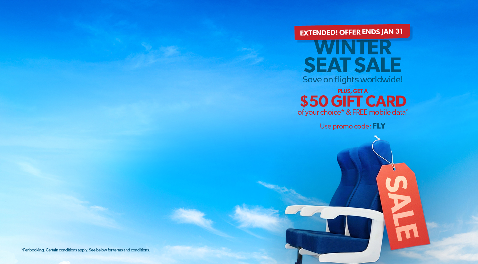 *Promo code FLY is applicable on select flight booking made online only between January 19 and 31, 2026, for travel departed between January 27, 2026 and December 31, 2026. Minimum purchase price of $99 per person before taxes and fees. Applicable on new bookings only and not applicable to pre-existing bookings. Customers must enter promo code FLY at checkout. Not applicable to group bookings. One EverythingCard e-gift card per booking (value of $50). Gift cards cannot be exchanged for any cash value. Not combinable with any other discounts or promo codes. The digital EverythingCard gift card will be sent electronically to the email address provided within 2-4 weeks of the customers return date. One eSIM card will be issued per booking. Customers will receive the eSIM card by email to the email address on the booking prior to the scheduled departure date. eSIM cards have no cash value. Approximate retail value of $100 based on 1 passenger during a 7-night stay at select destinations. e-SIM cards are not available for use in the following destinations: Aruba, Saint Martin, Zimbabwe, Togo, Equatorial Guinea, Angola, Namibia, Belize, Tajikistan, Yemen, Guernsey, Haiti, Kiribati, Nauru, Northern Mariana Islands, Republic of the Congo, Saint Vincent and the Grenadines, Timor-Leste, Saint Barthelemy, Vanuatu, Burundi, Ethiopia, French Polynesia. redtag.ca does not guarantee network availability, coverage, speed, or compatibility of the bonus eSIM with all devices. Network performance and access are subject to the policies of third-party service providers. redtag.ca shall not be liable for any loss, damage, or inconvenience arising from the use or inability to use the bonus eSIM, including but not limited to roaming charges, data overages, or connectivity issues. The promo code amount is non-negotiable. Not combinable with any other discounts or promo codes. Data is shared with 3rd parties to fulfill extra services such as eSIM'. The offer is capacity controlled and can be changed or withdrawn at any time without notice. redtag.ca reserves the right to expire the promo code if it is not redeemed. All promotional rules are to be used in conjunction with the redtag.ca website terms of use. © 2026 redtag.ca. All Rights Reserved.
