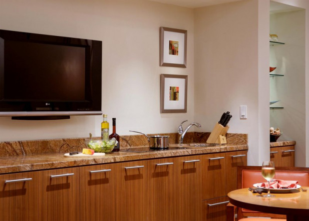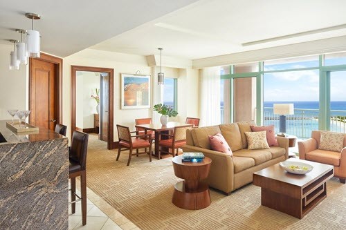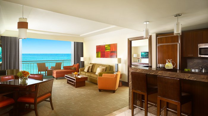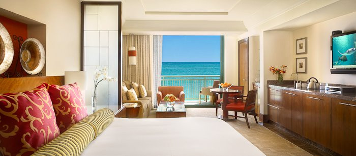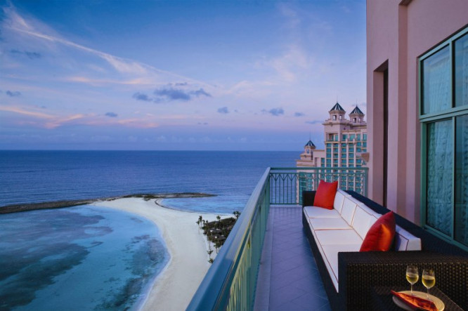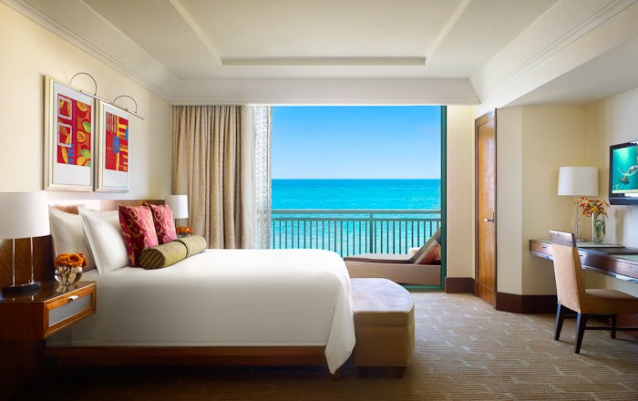The Reef Atlantis features all the conveniences of home with a full kitchen or kitchen area complete with linens, cookware, table settings, dishwasher, refrigerator, and private balconies with water views. The Reef Atlantis and The Cove Atlantis are part of the Atlantis complex on Paradise Island.
