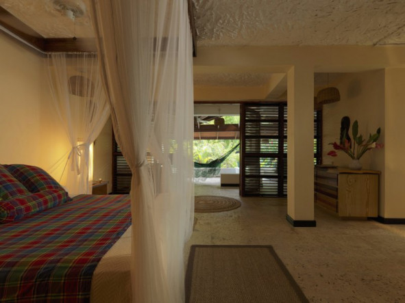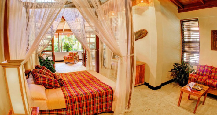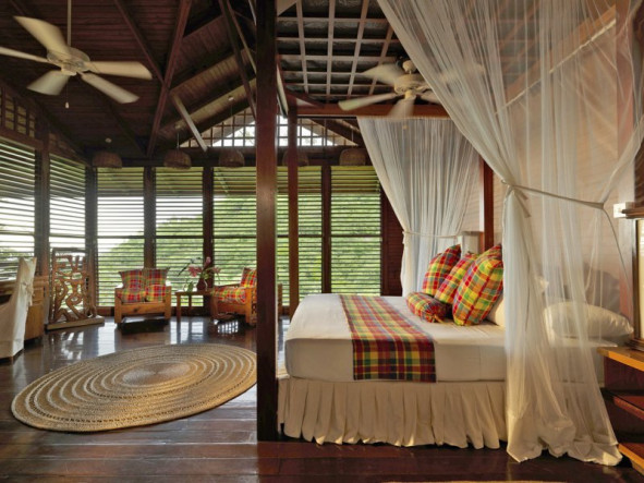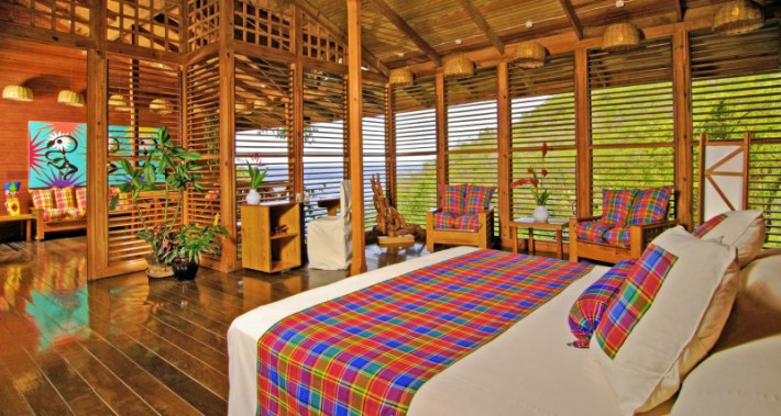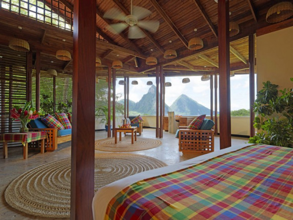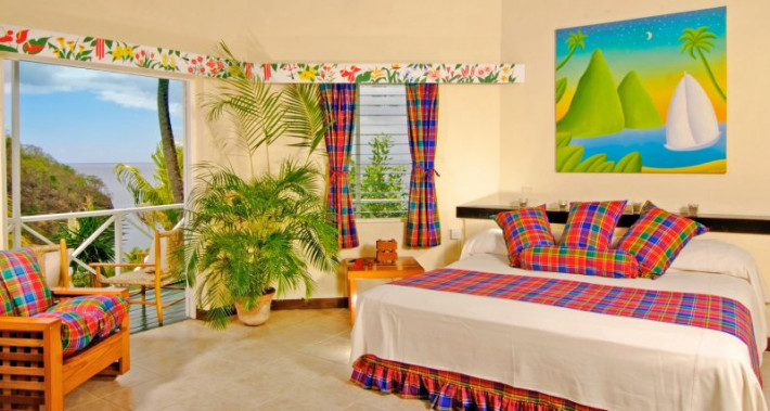 The Anse Chastanet Hotel Resort offers 49 individually designed rooms, 37 of which are scattered about a lush hillside, and 12 which are nestled within a tropical garden at beach level. The use of local woods and other local products in the room decor and furnishings is emphasized. Cushions and bedspreads are made from colourful cotton fabrics called madras, the island's "national cloth." Even the resort bathrobes are locally made and have become a popular souvenir item!