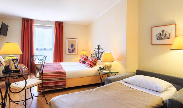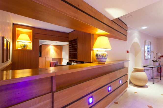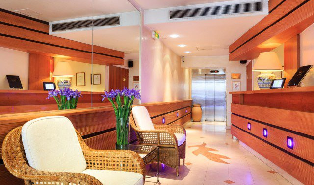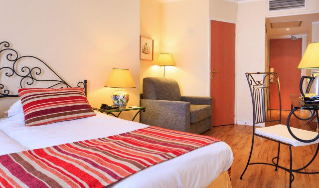 During the visit, the light colours of the walls contrast with furniture, accessories, geometric fabrics and suspensions. Furniture is modern and preserve a certain elegance of the French hotel business.