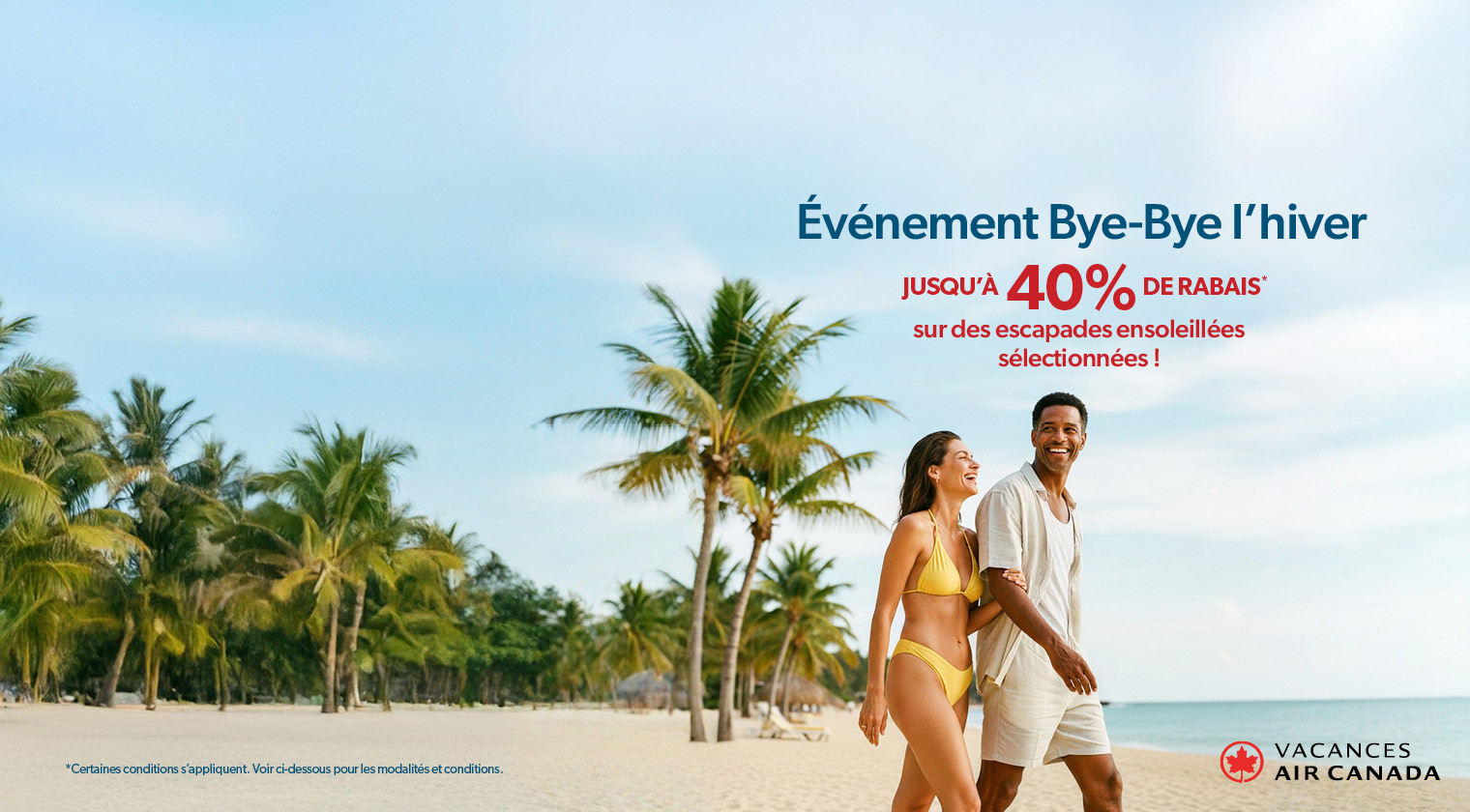 Événement bye-bye hiver : Économisez jusqu'à 40 % sur des forfaits vacances sélectionnés. Valide pour les nouvelles réservations de forfaits vacances sélectionnés. Offre valide entre le 5 janvier et le 8 février 2026. Le rabais est déjà reflété dans les prix affichés en ligne et ne s'applique pas aux suppléments, frais, taxes et redevances. Les départs doivent se faire dans la période suivante : 6 janvier - 30 avril 2026. Un séjour minimal de 3 nuits est requis. Non cumulable avec toute autre offre, rabais ou promotion, sauf indication contraire. L'offre est soumise à un contrôle de capacité et peut être modifiée ou retirée à tout moment.