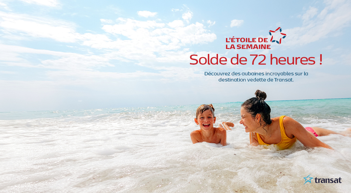 L’étoile de la semaine. Valide pour les nouvelles réservations de forfaits vacances sélectionnés, effectuées pendant la période du 72 heures (du mardi au jeudi), pour certaines dates de départ et de retour. Les prix affichés reflètent déjà les économies et ne s'appliquent pas aux suppléments, frais, taxes et redevances. La promotion est limitée à 20 sièges aux tarifs indiqués par départ, et elle peut être modifiée sans préavis. Un séjour minimal de 3 nuits est requis. Ne peut être jumelé à aucune autre offre, rabais ou promotion, sauf indication contraire. L'offre est soumise à un contrôle de capacité et peut être modifiée ou retirée à tout moment.
