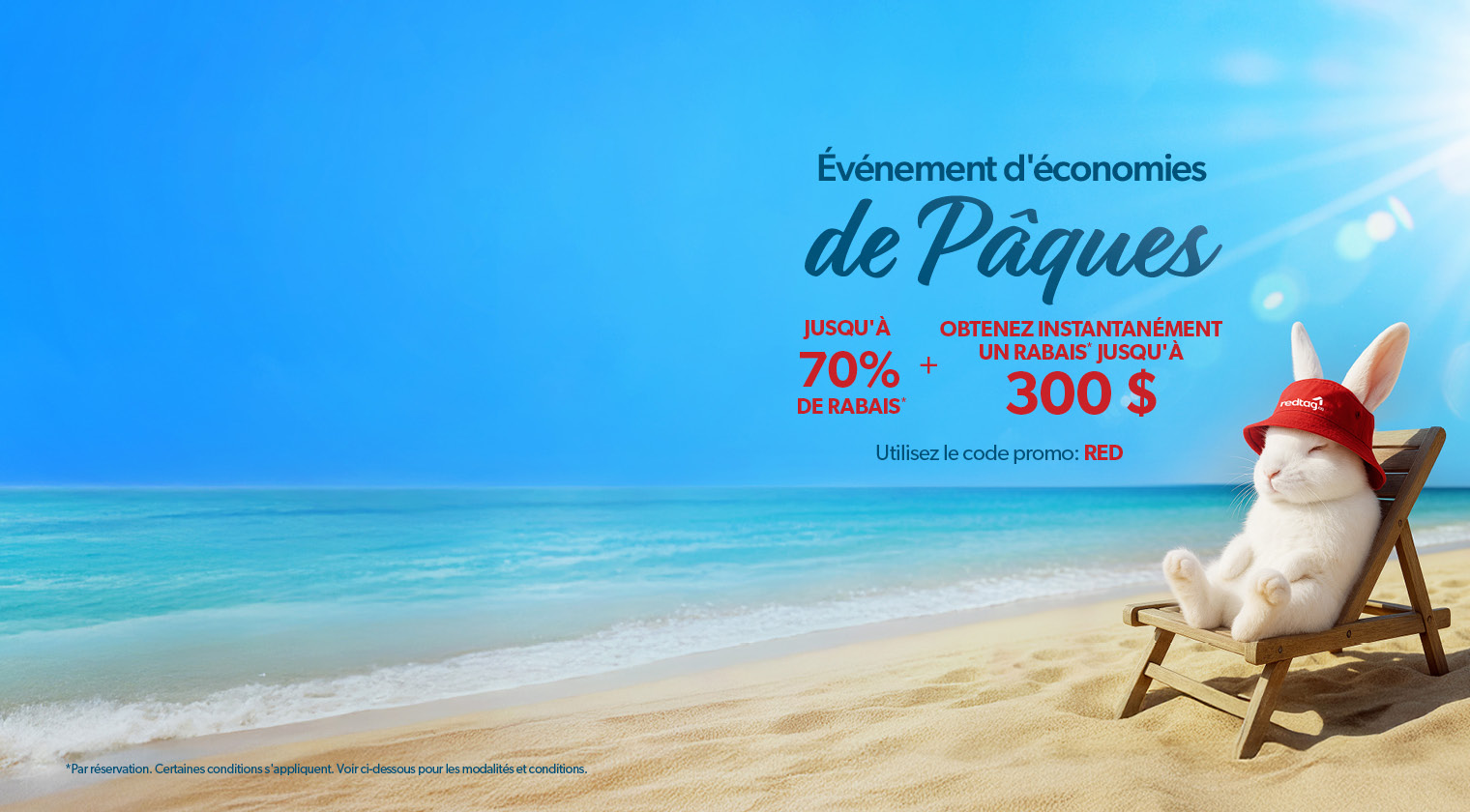 Le code promo de rabais RED s’applique aux nouvelles réservations de forfaits vacances sélectionnés effectuées en ligne auprès des fournisseurs participants, ainsi qu’aux forfaits vol et hôtel réservés entre le 2 avril 2026 et le 6 avril 2026, pour des voyages effectués entre le 3 avril 2026 et le 31 décembre 2026. Le rabais de 50 $ est applicable aux réservations avec un achat minimal de 899 $ à 1 298 $ par personne (avant taxes et frais), sauf indication contraire sur votre code promo. Valide pour les réservations en occupation double, triple ou quadruple. Un seul code promo par réservation (valeur de 50 $). Les réservations en occupation simple avec un prix d'achat minimal de 899 $ à 1 298 $ recevront un rabais de 25 $ par reservation. Le rabais de 75 $ est applicable aux réservations avec un prix d'achat minimal de 1 299 $ à 1 498 $ par personne (avant taxes et frais), sauf indication contraire. Valide pour les occupations double, triple ou quadruple. Un seul code promo par réservation (valeur de 75 $). Les réservations en occupation simple recevront un rabais de 37,50 $. Le rabais de 100 $ est applicable aux réservations avec un prix d'achat minimal de 1 499 $ à 3 998 $ par personne (avant taxes et frais). Valide pour les occupations double, triple ou quadruple. Un seul code promo par réservation (valeur de 100 $). Les réservations en occupation simple recevront un rabais de 50 $. Le rabais de 200 $ est applicable aux réservations avec un prix d'achat minimal de 3 999 $ à 6 998 $ par personne (avant taxes et frais). Valide pour les occupations double, triple ou quadruple. Un seul code promo par réservation (valeur de 200 $). Les réservations en occupation simple recevront un rabais de 100 $. Le rabais de 300 $ est applicable aux réservations avec un prix d'achat minimal de 6 999 $ et plus par personne (avant taxes et frais). Valide pour les occupations double, triple ou quadruple. Un seul code promo par réservation (valeur de 300 $). Les réservations en occupation simple recevront un rabais de 150 $. Le code promo ne peut être échangé contre de l’argent, n’est pas négociable, non cumulable avec d’autres offres ou codes promo, et ne s’applique pas aux forfaits Vacances WestJet ou Vacances Air Canada ni aux réservations de groupe. L’offre est soumise à disponibilité et peut être modifiée ou retirée sans préavis. Le code doit être appliqué au moment de la réservation. redtag.ca se réserve le droit d’expirer le code promo s’il n’est pas utilisé.