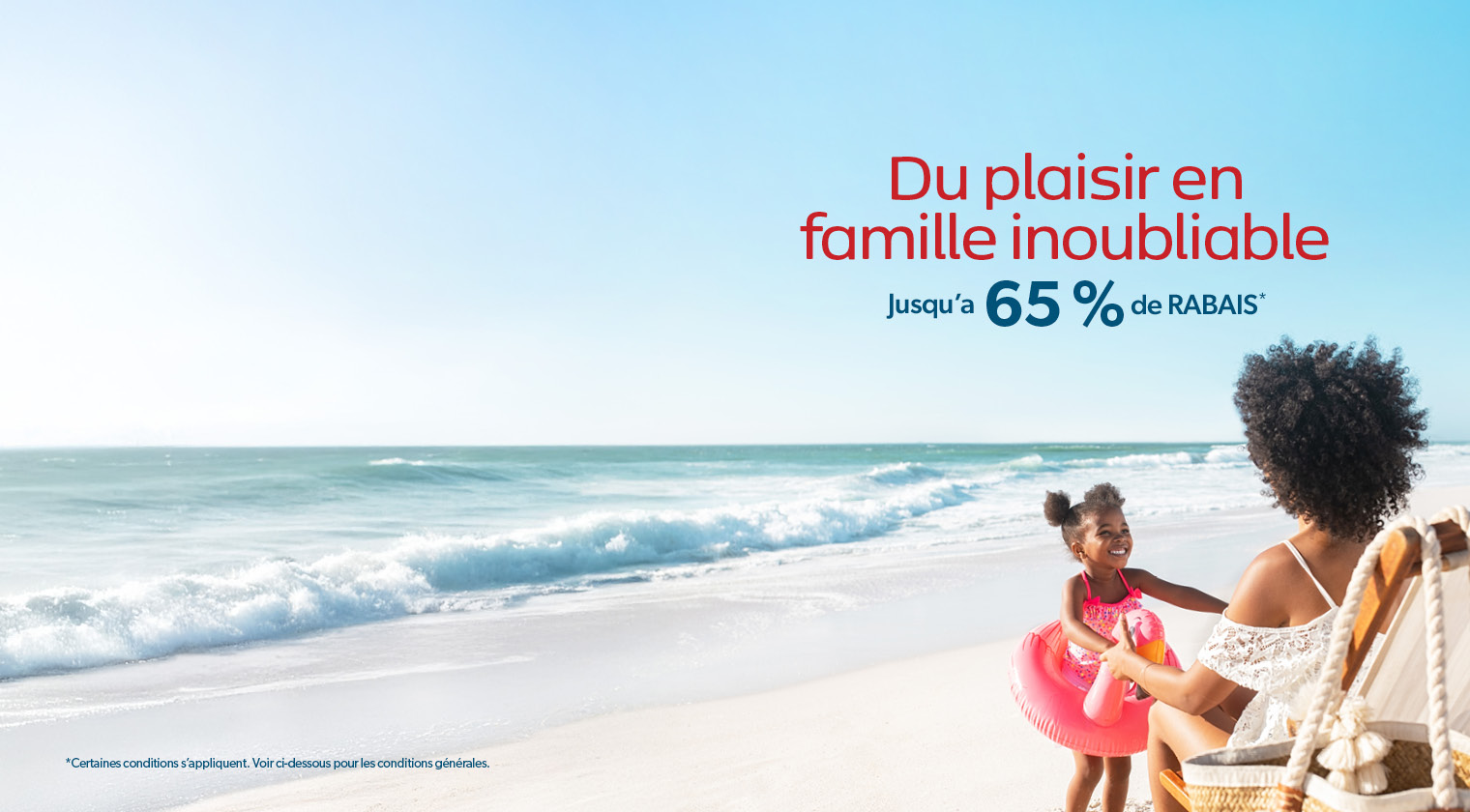 redtag.ca offre des vacances en famille et des forfaits vacances spéciaux à prix réduits pour au moins 5 personnes. Nous proposons des vols, des hôtels, forfaits de villégiature pour les familles nombreuses à destination du Mexique, de la République dominicaine, de Cuba et de superbes destinations des Caraïbes. Trouvez des tout-inclus:repas tout compris, boissons et des programmes d'activités dans d'excellents centres de villégiature situés à Cancún, Puerto Vallarta, Riviera Maya, Punta Cana, Varadero, Antigua, Barbade, Jamaïque, Turcs et Caicos, Sainte-Lucie et de nombreuses autres destinations au soleil que toute la famille pourra apprécier.