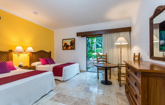 Accommodations at Puerto Vallarta's Hacienda Hotel: 155 Guest Rooms, Air Conditioning, Spacious Layouts, Color TV, 1 King Bed or 1 Double & 1 Single Bed, Daily Maid Service and a Purified Water System. Amenities & Services offered at the Hacienda Hotel include: a swimming pool, Jacuzzi, Beach Access, Swim Up Bar, Safety Deposit Boxes, Tropical Garden Atmosphere and the Restaurante Las Sabores de Mexico.