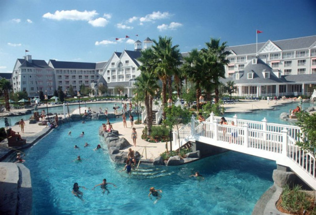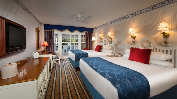 Public areas, Guest rooms and suites are adorned in dark wood and wicker furniture, portholes and simulated captain's wheels. Cast Members are decked out in ship's crew regalia, including navy blazers and captain's hats. Behind the Resort lie Stormalong Bay and Crescent Lake. Stormalong Bay spans 3 acres, with water slides emerging from the life-size replica of a wrecked ship, lagoons, a slow river to float along in inner tubes and a sand-bottom pool. At 25-acre Crescent Lake, Guests can rent a variety of watercraft (such as pedal boats and pontoons) from the Bayside Marina, go on a fishing expedition or take a private cruise on the Breathless, where at night one might see fireworks.