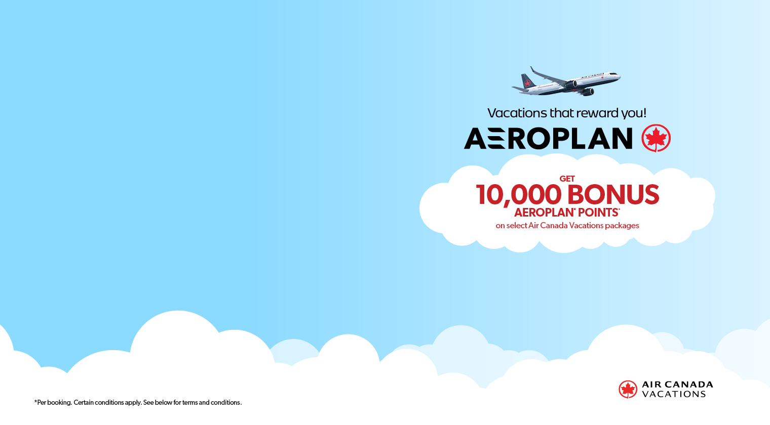 Exclusive 10,000 bonus Aeroplan points offer is applicable on select new Air Canada Vacations pre-packaged vacation bookings made between February 9 - 22, 2026, for travel departing between February 10, 2026 to June 30, 2026. Aeroplan points can only be applied to one passenger per booking. 10,000 Aeroplan points is applicable to bookings with a minimum purchase price of $1299 per person (before taxes & fees). Eligible on double, triple, and quadruple occupancy bookings. The Aeroplan points amount is non-negotiable. Not combinable with any other discounts or promo codes. Offer is combinable with the New Way to Earn Program. Not applicable to single occupancy, e-packages or group bookings. The promotion is capacity controlled and can be changed or withdrawn at any time without notice. Aeroplan number for one passenger per booking is required and must be provided at time of booking. Aeroplan points will be issued after the trip departure date has occurred. Aeroplan points earned in connection with this offer may take up to 30 days past the trip departure date to be posted to the Aeroplan member account.