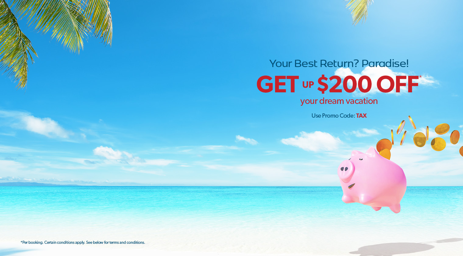 Promo code TAX is applicable on select pre-packaged vacations and flight & hotel bundle bookings made between April 14 - 19, 2026 for travel departed between April 15, 2026 to October 31, 2026. Bookings with a minimum purchase price of $899 - $1399 per person (before taxes & fees) will receive $50 off per booking, unless otherwise stipulated. One promo code per booking (value of $50). Bookings with a minimum purchase price of $1400 - $4999 per person (before taxes & fees) will receive $100 off per booking, unless otherwise stipulated. One promo code per booking (value of $100). Bookings with a minimum purchase price of $5,000 & up per person (before taxes & fees) will receive $200 off per booking, unless otherwise stipulated. One promo code per booking (value of $200). Not applicable to group bookings, e-packages, or single occupancy bookings. Not applicable on Air Canada Vacations, WestJet Vacations, or Transat bookings. Promo code cannot be exchanged for any cash value and must be entered or provided at the time of booking. The promo code amount is non-negotiable. Not combinable with any other discounts or promo codes. The offer is capacity controlled and can be changed or withdrawn at any time without notice. redtag.ca reserves the right to expire the promo code if it is not redeemed. All promotional rules are to be used in conjunction with the redtag.ca website terms of use. © 2026 redtag.ca. All Rights Reserved.