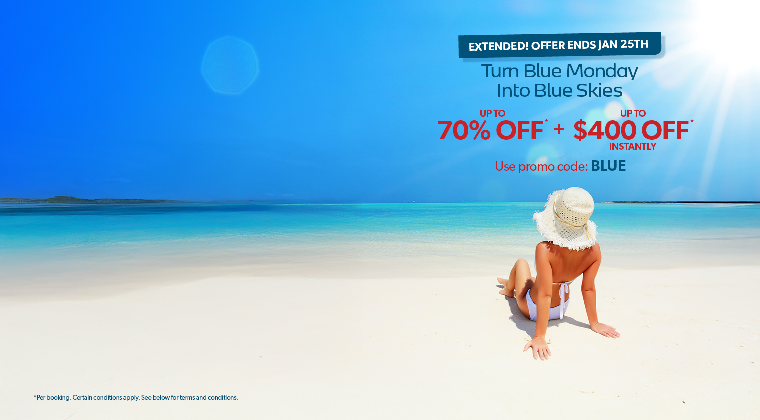Promo code discount BLUE is applicable on select new pre-packaged vacation bookings made online with select suppliers and flight & hotel bundles between Jan 19, 2026 and Jan 25, 2026, for travel departing between Jan 20, 2026 to Nov 30, 2026. $50 discount is applicable to bookings with a minimum purchase price of $999 to $1398 per person (before taxes & fees), unless otherwise stipulated on your promo code. Eligible on double, triple, and quadruple occupancy bookings. One promo code per booking (value of $50). Single occupancy bookings with a minimum purchase price of $999 to $1398 will receive a $25 discount per booking. $100 discount is applicable to bookings with a minimum purchase price of $1399 to $3998 per person (before taxes & fees), unless otherwise stipulated on your promo code. Eligible on double, triple, and quadruple occupancy bookings. One promo code per booking (value of $100). Single occupancy bookings with a minimum purchase price of $1399 to $3998 will receive a $50 discount per booking. $200 discount is applicable to bookings with a minimum purchase price of $3999 to $8998 per person (before taxes & fees), unless otherwise stipulated on your promo code. Eligible on double, triple, and quadruple occupancy bookings. One promo code per booking (value of $200). Single occupancy bookings with a minimum purchase price of $3999 - $8998 will receive a $75 discount per booking. $400 discount is applicable to bookings with a minimum purchase price of $8999 and up per person (before taxes & fees), unless otherwise stipulated on your promo code. Eligible on double, triple, and quadruple occupancy bookings. One promo code per booking (value of $400). Single occupancy bookings with a minimum purchase price of $8999 and up will receive a $150 discount per booking. Promo code cannot be exchanged for any cash value. Applicable to online bookings only. The promo code discount amount is non-negotiable. Not combinable with any other discounts or promo codes. Not applicable to e-packages or group bookings. Not applicable on WestJet Vacations or Air Canada Vacations. The promo code offer is capacity controlled and can be changed or withdrawn at any time without notice. Promo Code must be provided at the time of booking. redtag.ca reserves the right to expire the promo code if it is not redeemed. All promotional rules are to be used in conjunction with the redtag.ca website terms of use. © 2026 redtag.ca. All Rights Reserved.