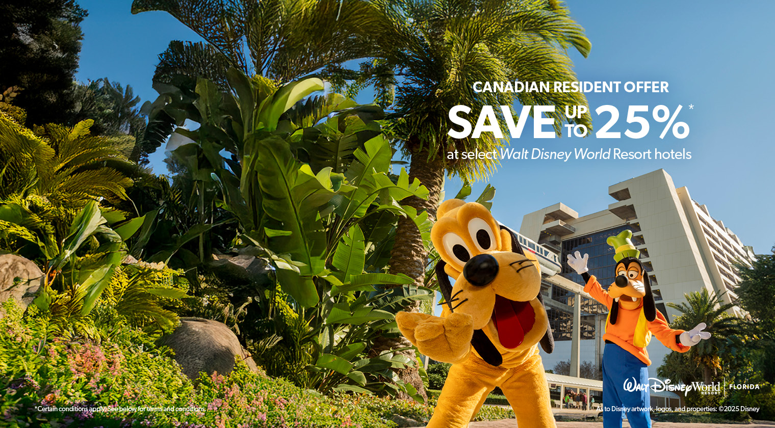 *Save up to 25% at select Walt Disney World Resort hotels when booked by April 30, 2026 for travel between January 4, 2026 - April 30, 2026. Savings based on non-discounted rate for the same room and category. Savings may not be redeemed for cash and are non-transferable. There is no cash reimbursement of unused discount. Discounts vary depending on resort, season and length of stay. Some hotels are excluded from this offer. Savings are reflected in the price displayed online. There is 0% discount on Fridays and Saturdays from November 9 – 22, 2025 and January 4 – February 21, 2026. Offer is subject to availability, capacity controlled, and may be withdrawn at any time without notice. Other restrictions may apply. Promotional offer, discounts, and availability are subject to change without prior notification and were available on October 23, 2025. As to Disney artwork, logos, and properties: © 2025 Disney.